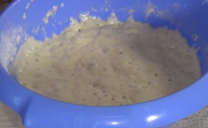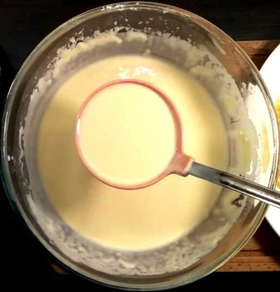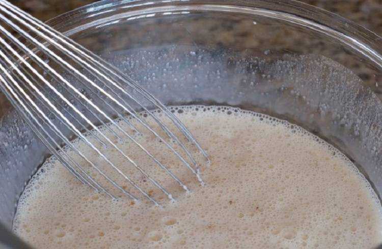 - Добавляем в тесто небольшими порциями оставшееся молоко и взбиваем вилкой или венчиком. В результате должно получиться тесто, которое по консистенции напоминает жидкую сметану. Если тесто густоватое, можно влить немножко кипяченой воды.