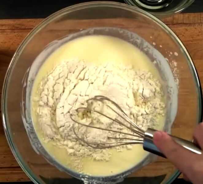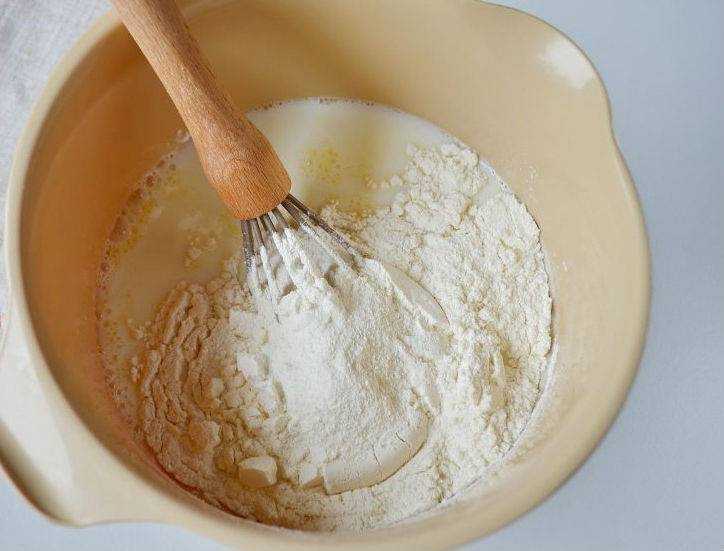 - Всыпьте муку и размешивайте массу, пока не исчезнут все комки.