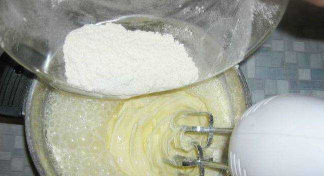 - Заранее просеянную муку введите в тесто небольшими порциями, не прекращая взбивать компоненты теста.