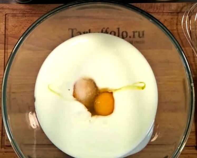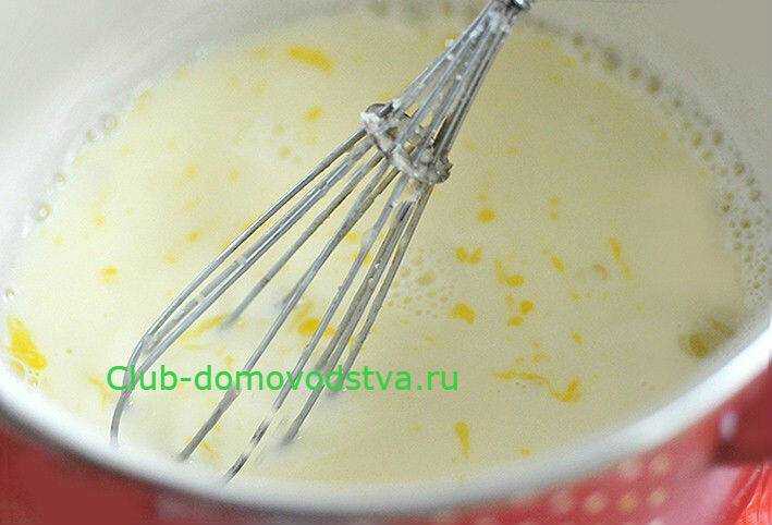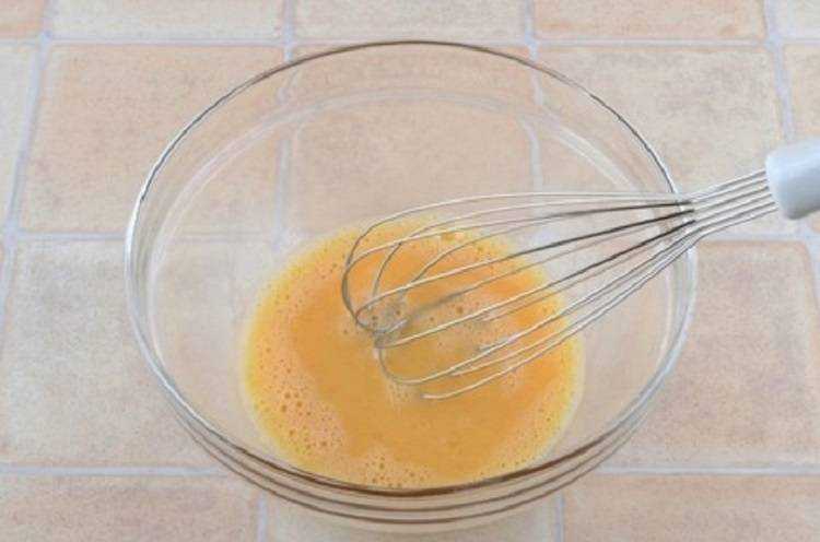 1. В первую очередь для теста отделите белки от желтков. Желтки взбейте венчиком. Затем в отдельную посуду влейте коровье молоко, добавьте соль и сахар, взбитые желтки. Перемешайте.