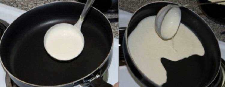 Взбить содержимое миски миксером несколько минут до получения сметанообразной массы. Поставьте сковороду на огонь и смажьте ее небольшим количеством растительного масла. На дно вылить немного теста и поворачивать ручку до тех пор, пока оно равномерно не распределиться по всей окружности.
