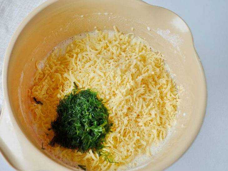 - Очистите от кожуры цуккини и на терке натрите, отожмите излишний выделившийся сок. Отправьте цуккини в тесто и перемешайте. Если оно стало слишком густым, влейте немного воды теплой или кефира.