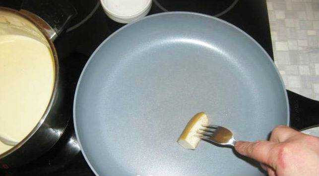 Для жарки блинчиков рекомендуется использовать антипригарную или чугунную толстостенную сковороду. Чтобы блины не прилипали ко дну, сковородку необходимо хорошо разогреть, после чего смазать подсолнечным маслом. Затем распределите по поверхности тонкий слой теста.