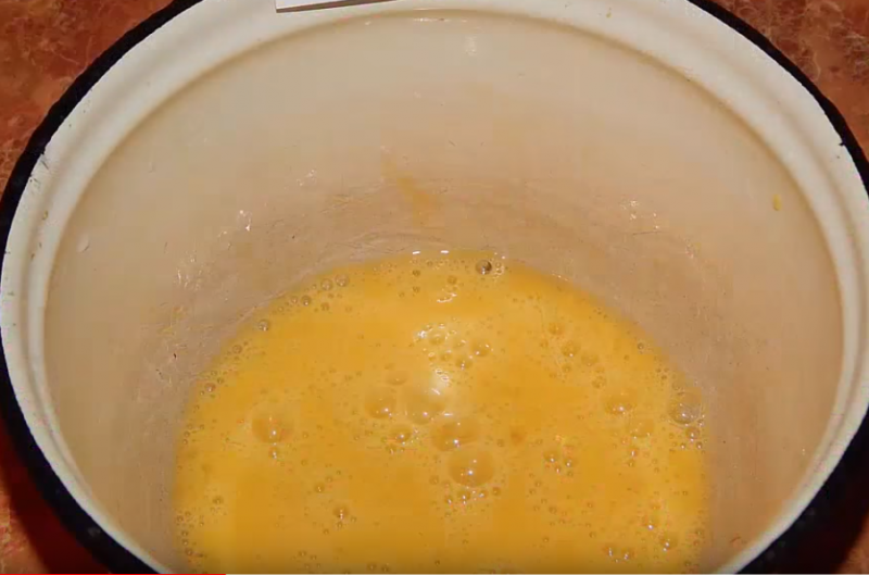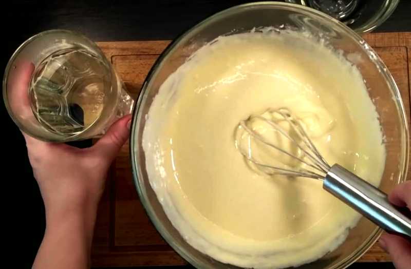 1. Яйца взбиваем с сахаром, постепенно добавляем муку с разрыхлителем, молоко и воду. Лучше выбрать минеральную газированную. Жидкое тесто должно иметь однородную консистенцию. В конце добавляем растительное масло.