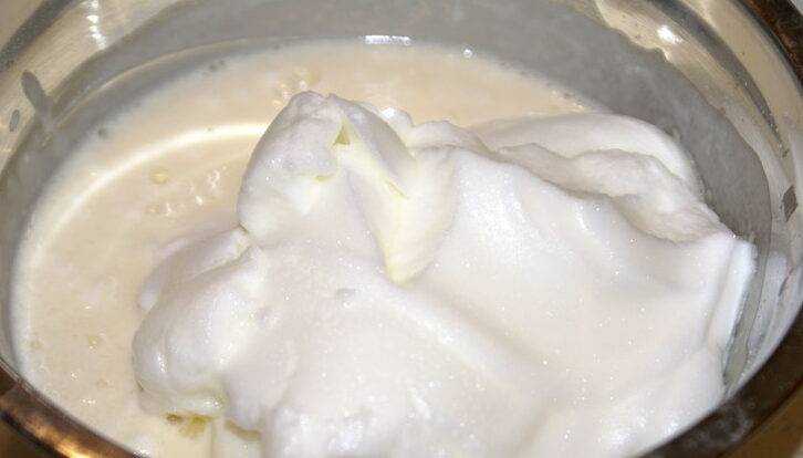 - Вбейте в получившееся молоко 2 яйца, добавьте щепотку соли и 2 столовые ложки сахарного песка. Снова хорошо все взбейте.