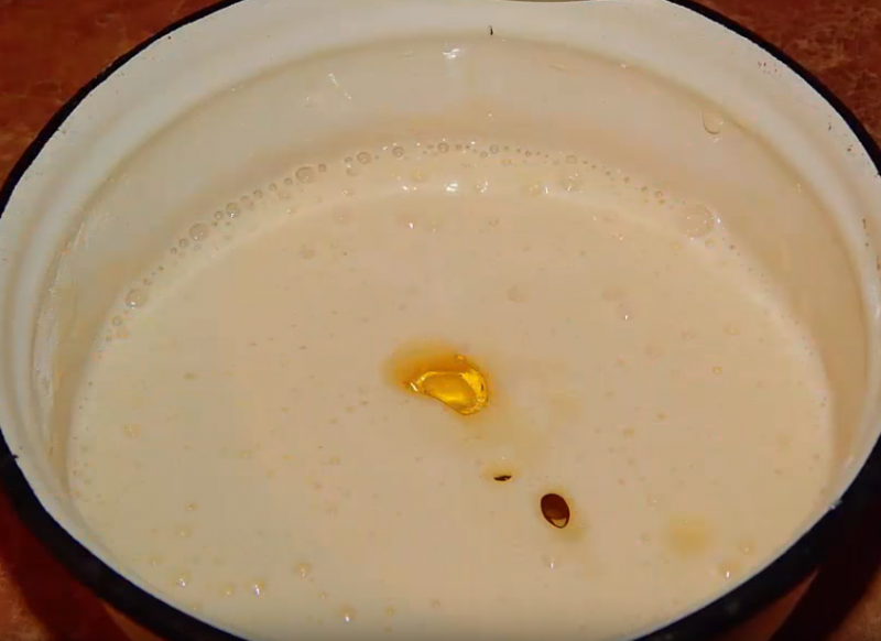 - В самом конце добавьте в тесто 2 столовые ложки растительного масла (это убережет ваши блинчики от пригорания к сковороде в процессе жарки). Оставьте тесто при комнатной температуре настояться. Обычно достаточно 20 минут, чтобы тесто успело разойтись.