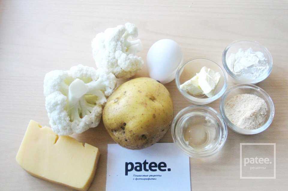 Для приготовления таких котлет необходимо взять: цветную капусту, яйцо, картофель, масло сливочное, масло подсолнечное, панировочные сухари, муку, соль, твердый сыр.
