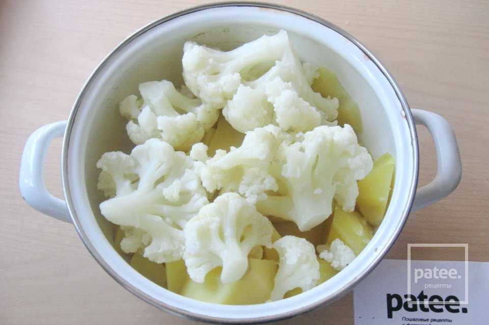 Цветную капусту разобрать на соцветия и промыть под проточной водой. Подготовленную капусту отварить на пару до мягкости и остудить.