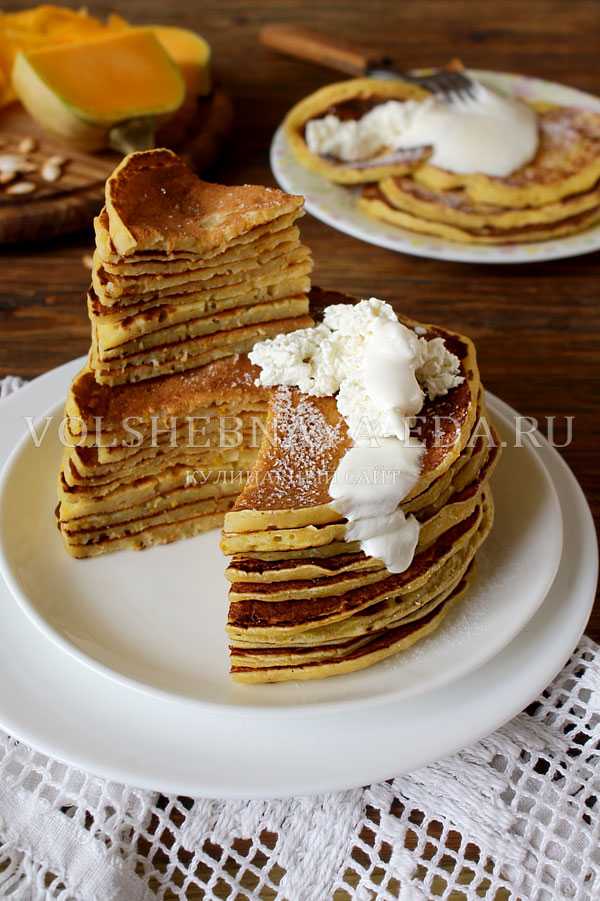 Подаем домашние тыквенные панкейки, например, со сметаной и творогом.