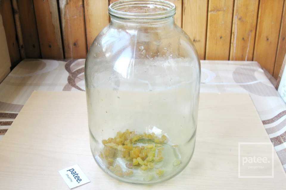 Приступаем к приготовлению кваса. В чистую банку кладем изюм. Он придаст фруктовый вкус и резкость напитку.
