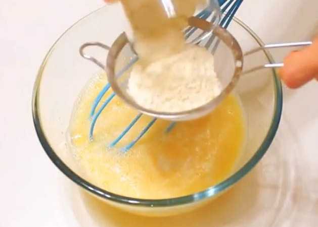 2. После всех манипуляций просейте прямо над яичной массой через сито муку, перемешайте и добейтесь однородной консистенции, как будто это густая сметана. Теперь влейте воду и растопленное сливочное масло и заново размешайте.