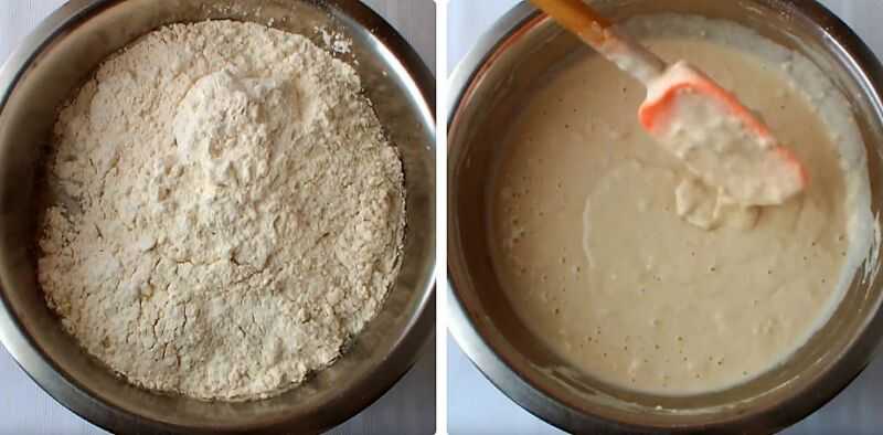- Влить оставшуюся воду, следом муку. Размешать и оставить на полчаса.