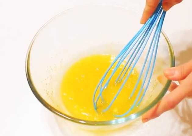 - Избавив яйца от скорлупы, перелить в чашу и взбивать до появления легкой пены. Подсолить и подсластить. Перемешивать, пока сахарные кристаллики не растворятся.