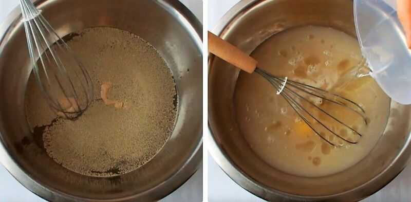 - В глубокой миске смешайте сухие ингредиенты, влейте воду и растительное масло. Используя венчик, разбейте все комочки. Оставьте под крышкой минут на 40. За это время она увеличится вдвое.