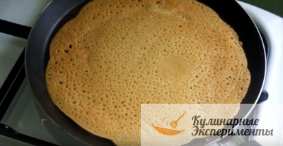 Раскалите сковороду, смазанную маслом. Распределите по дну тонкий слой теста и обжаривайте на среднем огне до золотистого цвета с обеих сторон.