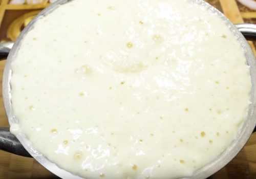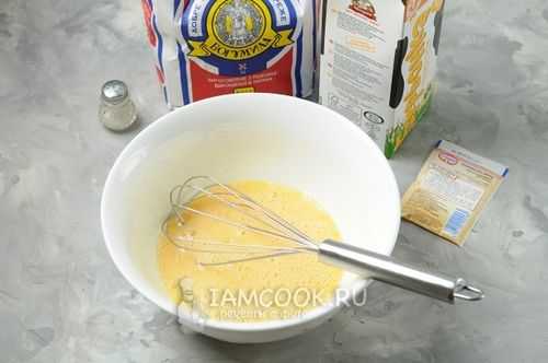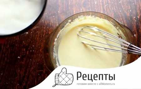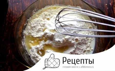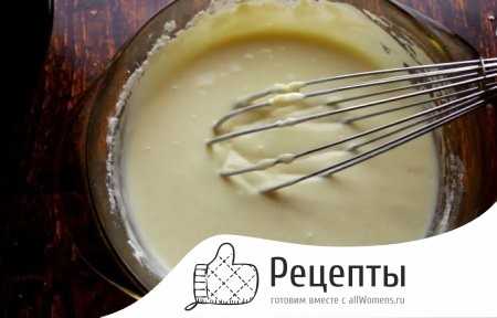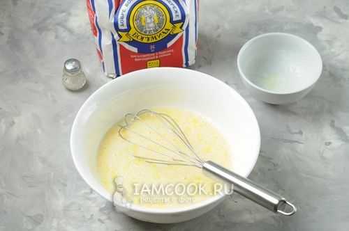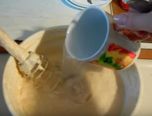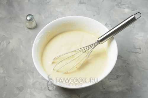 - Взбить кухонным венчиком либо миксером смесь. На выходе масса должна приобрести однородность. В ней не должны встречаться комочки, состоящие из сгустков муки.