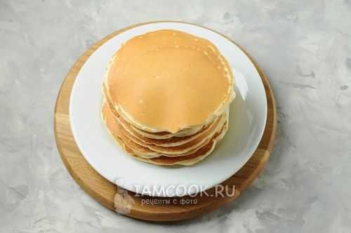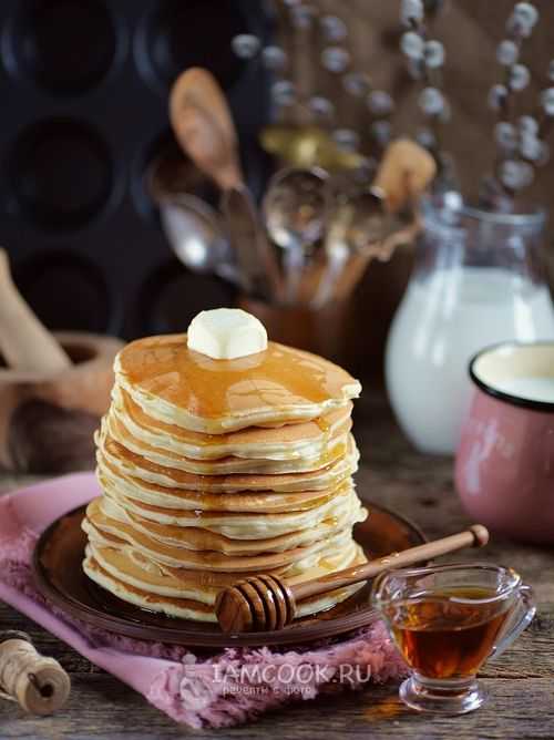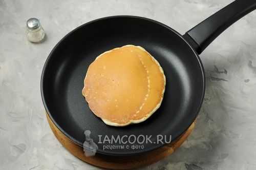 Выкладывайте тесто половником на смазанную сковороду, обжаривайте пышные блинчики с двух сторон. Смазывайте каждый из них сливочным маслом, сверху кладите следующий панкейк. Стопку блинов лучше накрывать крышкой, чтобы они не обветрились.