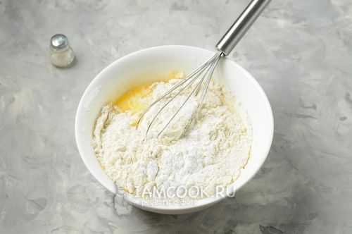 Добавьте просеянную муку с разрыхлителем и щепотку соли.