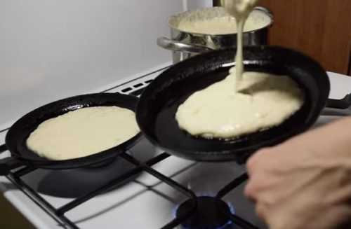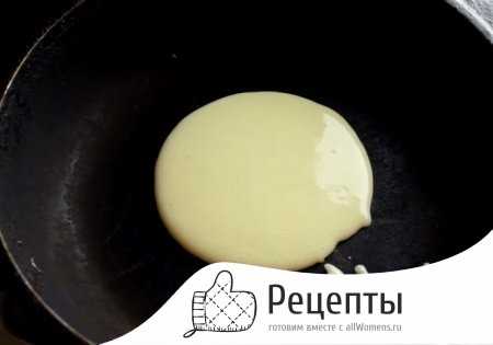 - Теперь можно выпекать блины. На раскаленную сковороду влить тесто.