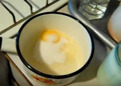 - Яйца разбиваем в кружку и перетираем с сахаром.