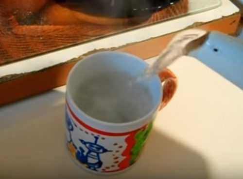 4. Вскипятите чайник воды. В кружку насыпьте пищевую соду, а затем туда же налейте кипяток, сода запенится и зашипит. Размешайте ее ложкой, чтобы она растворилась полностью.