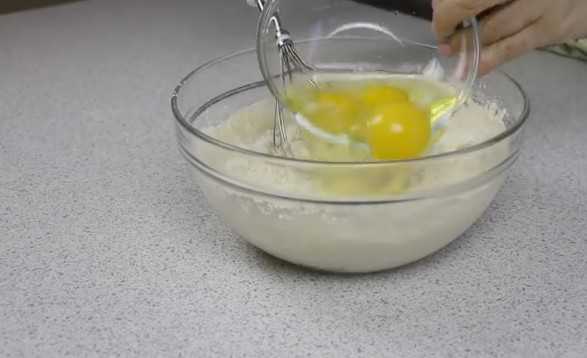 4. И теперь вбейте куриные яйца. И вот далее, вам нужно так перемешать жидкость, чтобы она получилась без комков и всяких мучных сгустков. Поэтому не торопитесь переходить к следующему шагу, пока не убедитесь в том, что нет комочков.