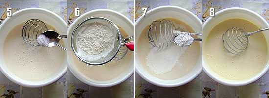 При работе с пищевым разрыхлителем этого делать не надо. Соду или пищевой разрыхлитель плавно вмешиваем в приготовленное тесто.