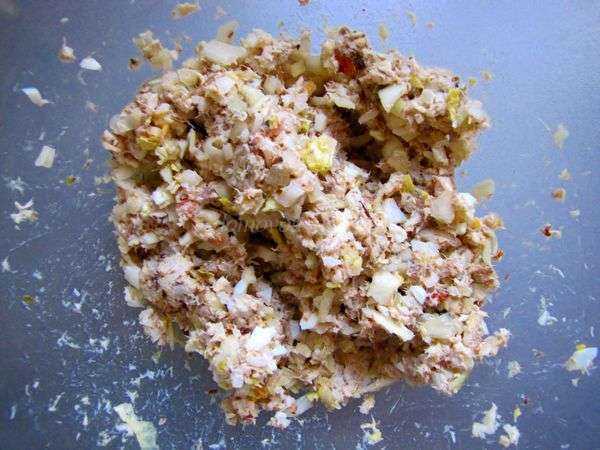 Очень важно измельчить мелко-мелко все компоненты, даже свежую икру скумбрии, так как она в оболочке. Это касается и рыбного филе, которое измельчается и перемешивается со всеми продуктами в глубокой миске