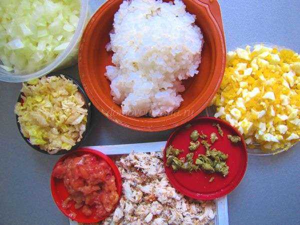 Начинка для блинчиков из рисовой бумаги. Отвариваем яйцо, отдельно варим рис. Каперсы подсушиваем (маринад удаляем максимально), лук чистим и измельчаем. Измельчаем и листья китайской капусты