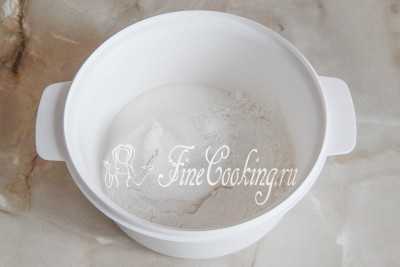 В миске смешиваем сыпучие продукты: просеиваем рисовую муку с кукурузным крахмалом, добавляем соль и сахар.