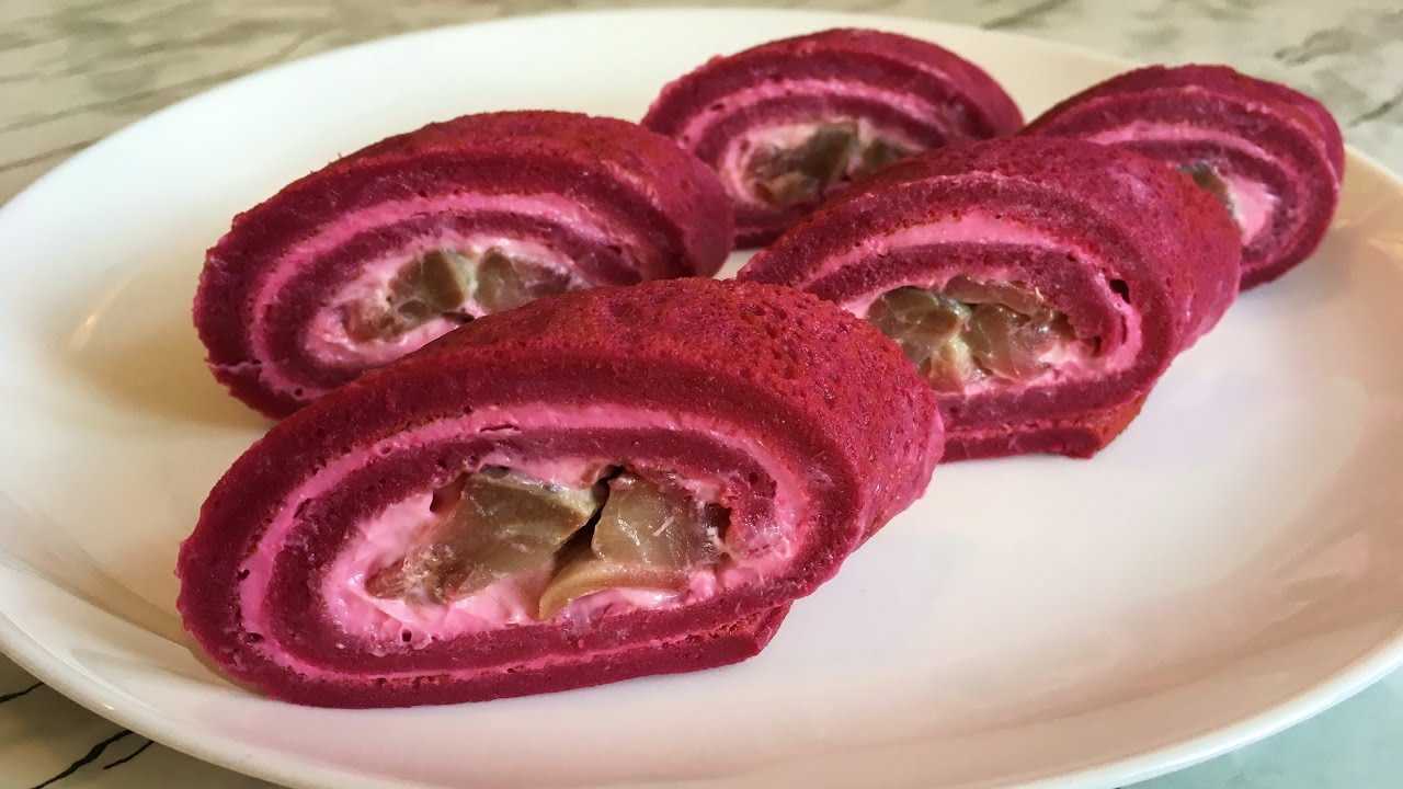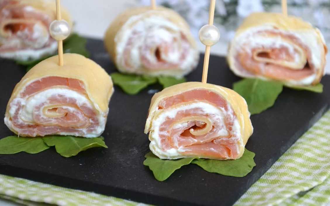 Наносим начинку слоем средней толщины (3-4 мм) на блинчики и закручиваем. В зависимости от того — какого диаметра их испекли — мы либо нарезаем блины на части, либо, если выпечка готовилась на маленькой сковороде (до 20 см в диаметре), можем оставить так.
