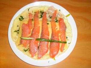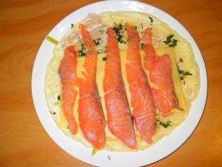 Тем кто любит острое можно посоветовать добавить в майонез измельченный зубчик чеснока и растереть, этим смазывать блин. Также можно слегка поперчить блин, смазанный майонезом и семгу. Порежьте зелень и немного посыпьте на блин.