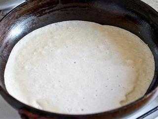 Налить немного теста и равномерно распределить его по поверхности сковороды, помогая себе столовой ложкой.