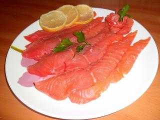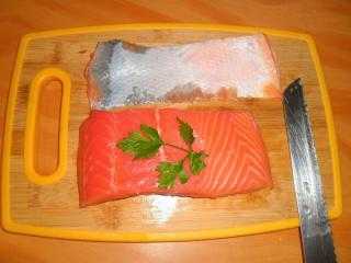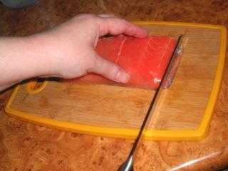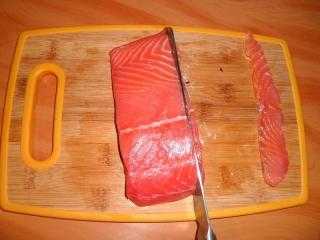 3. Режем семгу на тонкие ломтики (рыбу неплохо немного подморозить, чтобы было легче резать и смазывать каждый раз нож растительным маслом, чтобы не прилипала):