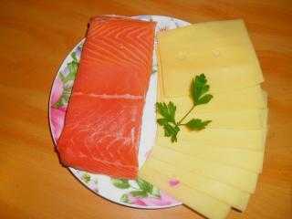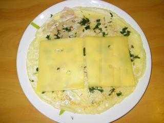 7. Выкладываем на смазанный блин две пластинки сыра. На сыр — рыбу, на верхнюю часть блина не кладите ничего, чтобы когда свернем рулет, начинка не торчала и не вываливалась. Как видите на первый блин я положила начинку до самого верха, но следующие, учтя ошибку, делала правильно.