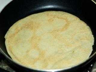 Не надо поджаривать слишком сильно, так как нужно, чтобы блин был эластичным, следите за краешками блина, как увидите, что они стали слегка коричневатыми, а тесто полностью пропеклось, переверните блин на другую сторону (проведите лопаточкой по всему краю блина, чтобы отделить его от краев сковороды, затем пропустите лопаточку под блин, осторожно приподнимите и переверните). Дальше жарим пока не закончится тесто: