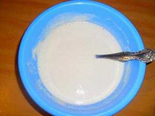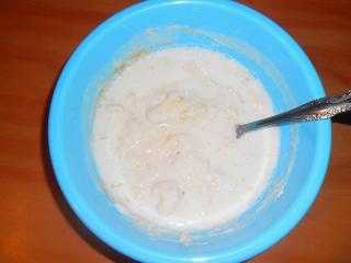 Начните размешивать и смотрите по консистенции теста, если слишком густое, добавляйте понемногу молоко (может потребоваться больше, чем стакан, если молока больше нет, замените водой), тесто должно обрести консистенцию негустой сметаны.