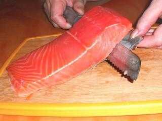Дальше отделяем филе от кожи. Делается это очень легко. Сделайте небольшой надрез между кожей и мякотью рыбы, возьмитесь за край кожи и ножом срезайте мякоть, упор ножа делайте на кожу, чтобы она снялась чисто, без частичек мякоти рыбы: