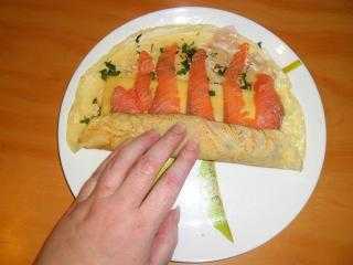 Наносим начинку слоем средней толщины (3-4 мм) на блинчики и закручиваем. В зависимости от того — какого диаметра их испекли — мы либо нарезаем блины на части, либо, если выпечка готовилась на маленькой сковороде (до 20 см в диаметре), можем оставить так.