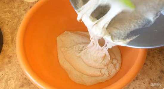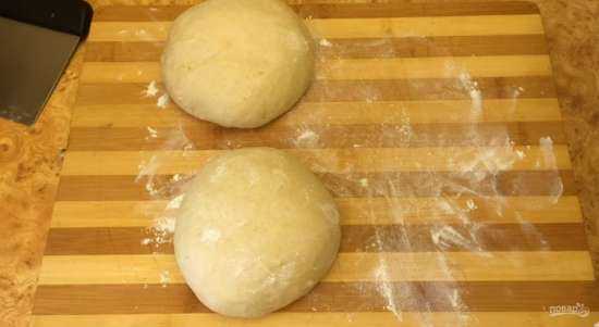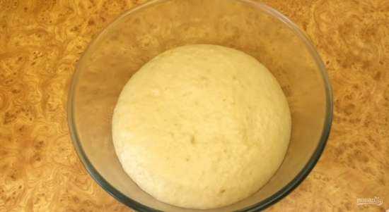 Перемешайте тесто в течение 1 минуты на первой скорости, затем замесите тесто в течение 5 минут на второй скорости. Округлите тесто и переложите в миску, смазанную растительным маслом. Накройте тесто пленкой и оставьте на 3-4 часа при комнатной температуре.