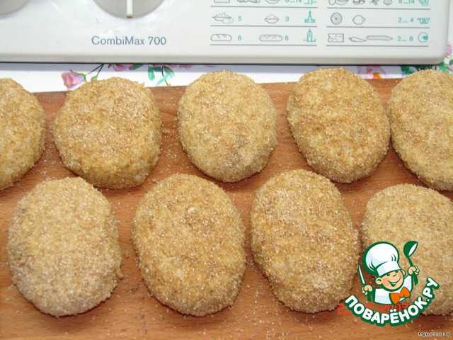3. Филе перекрутите на мясорубке вместе с хорошо отжатым батоном и спассерованными овощами. Введите сырое яйцо, посолите, приперчите по вкусу и вымесите фарш. Не давая расстояться, сформуйте небольшие овальные котлетки и запанируйте их в сухарях со всех сторон.