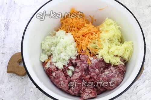 Хлеб положить в глубокую емкость, залить теплой водой или молоком, оставить на 15-25 минут. В это время овощи почисть, помыть и просушить с помощью салфетки. Натереть их на терке. Сок отжимать не нужно. Соединить овощи с фаршем. Затем тщательно все перемешать. Разбухший батон отжать от жидкости и размять до состояния крошки. Добавить к фаршу, тщательно перемешать. Туда же вбить яйца. Высыпать молотый перец с солью.