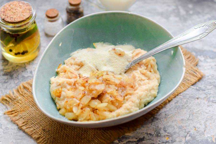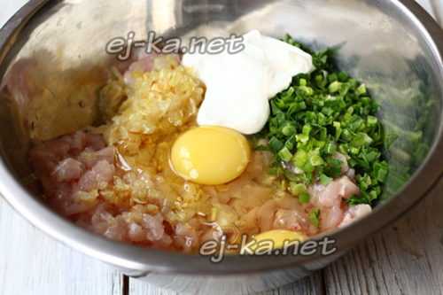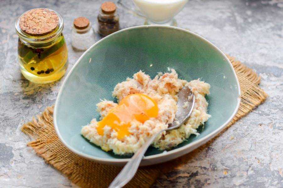 В получившуюся кашицу добавить пассировку, яйцо и майонез. Всыпать немного муки. Ее количество может меняться в зависимости от того, насколько сочное и жирное филе