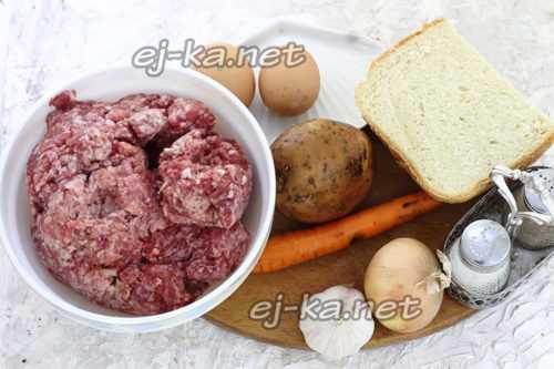свино-говяжий фарш – 1 кг; батон (он может быть свежим или черствым, это не важно) – 150 г; яйца куриные – 2 шт.; картофель – 1 шт.; лук – 1 шт.; морковь – 1 шт.; чеснок – 1 головка; масло подсолнечное – 2-3 ст. л.; соль, молотый черный перец по вкусу