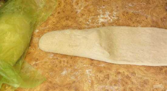 Выложите тесто на рабочую поверхность, присыпанную мукой, и округлите. Разделите тесто на 2 части и округлите. Накройте одну часть теста пленкой, пока будете работать с другой. Раскатайте тесто в цилиндр длинной 40 см.