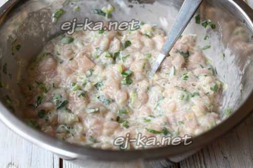 Важно чтобы фарш не был слишком сухим или жидким. Все перемешать и поставить в холодильник на 15 минут