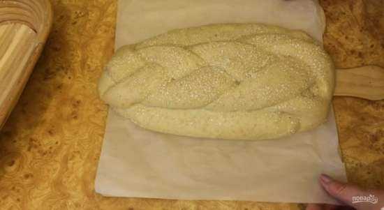 1/3 часть цилиндра распластайте руками и раскатайте в тонкий пласт. Разрежьте данную часть теста на три полоски, каждую скрутите три раза и заплетите в косу. Выложите косу сверху на нераскатанную часть теста, подогните ее конец под тесто и переложите хлеб на пергамент.