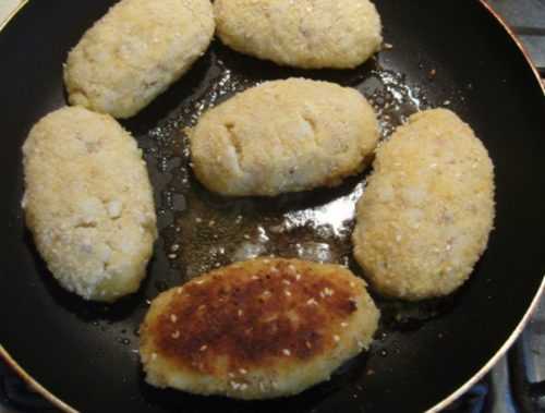 Из готовой смеси слепить котлеты, обвалять их в смеси из панировочных сухарей с кунжутом, обжарить на сковороде. На термообработку каждой стороны должно уйти около 7 минут.