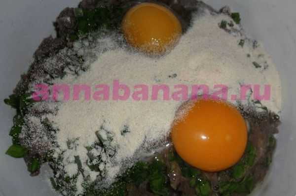 Туда же добавить яйца и сметану (если нет в наличии, можно заменить майонезом). Также насыпать муку (вместо нее можно использовать крахмал). Все тщательно перемешать. Если фарш окажется слишком жидким, можно еще добавить муки. Дать массе настояться при комнатной температуре четверть часа, чтобы она загустела