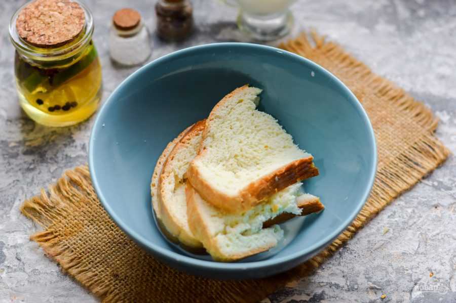 - Замочите в теплой воде ломтики батона и отожмите их.